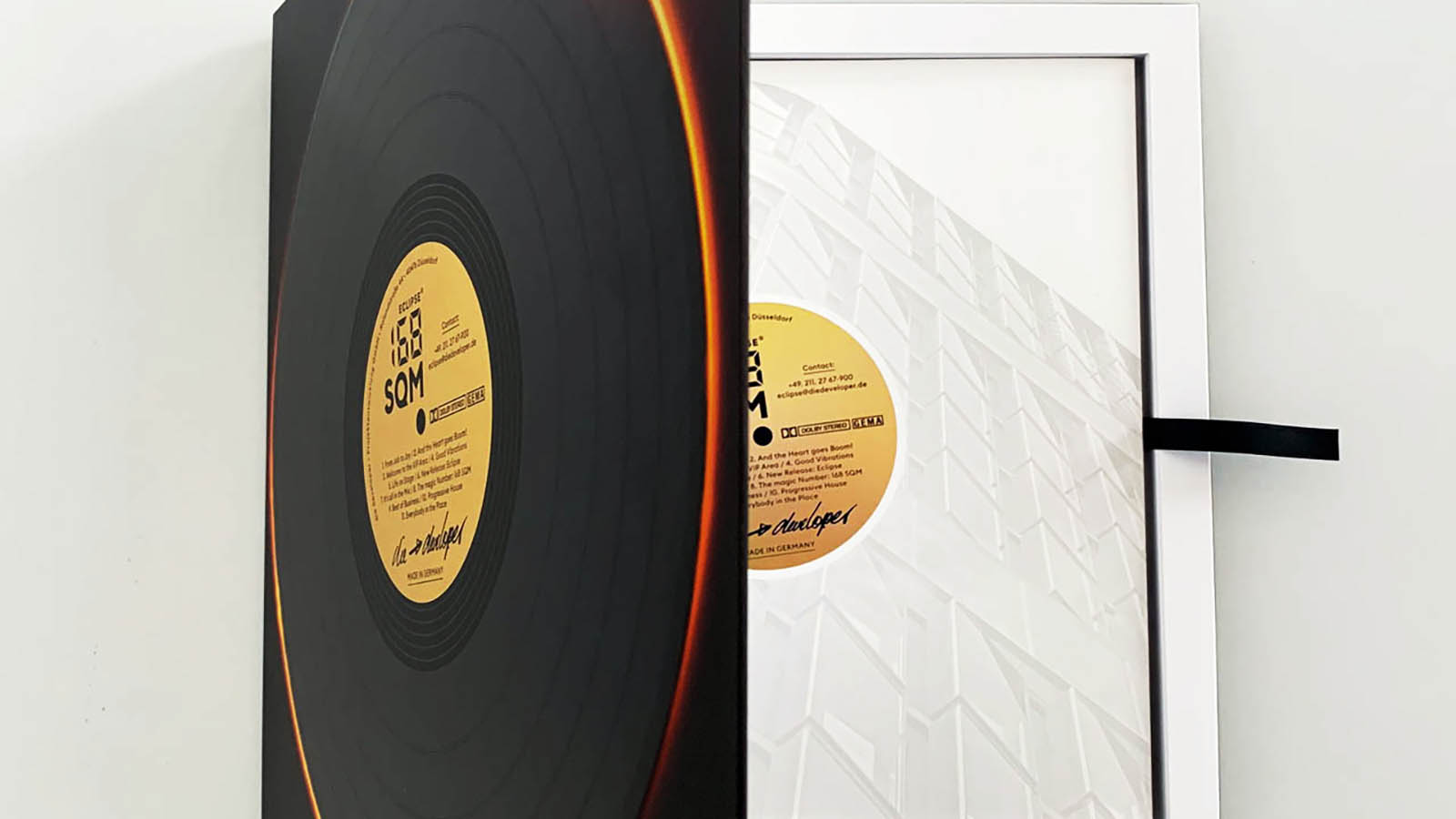 Der perfekte Büro-Mix wird Empfängern der Box entsprechend der Marketing-Story präsentiert: Die Box, in der sich das Exposé befindet, trägt eine Relief-Lackierung, die die Rillen eine Schallplatte imitiert.